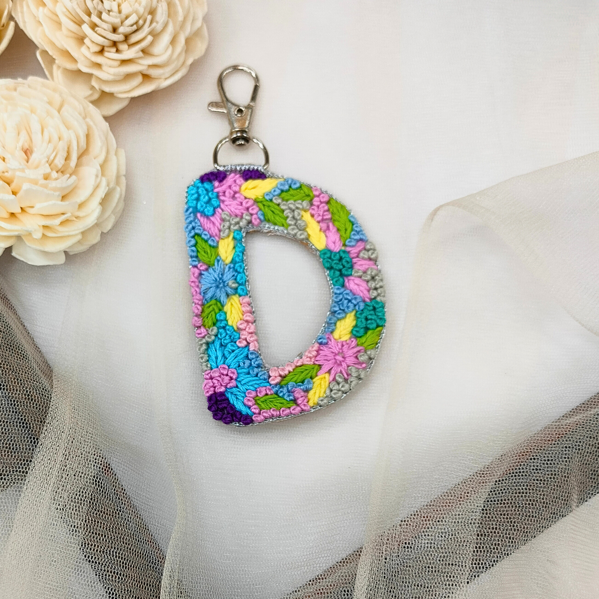 Make a statement with this beautifully handcrafted initial keychain, adorned with intricate thread embroidery and floral detailing. Designed to bring a personal touch to your bags, keys, or gifts, it features a sturdy metal clasp for easy attachment. Lightweight yet striking, this piece combines artistry and functionality—perfect as a thoughtful gift or a stylish everyday accessory. Add a bit of handcrafted charm to your essentials with this unique piece.