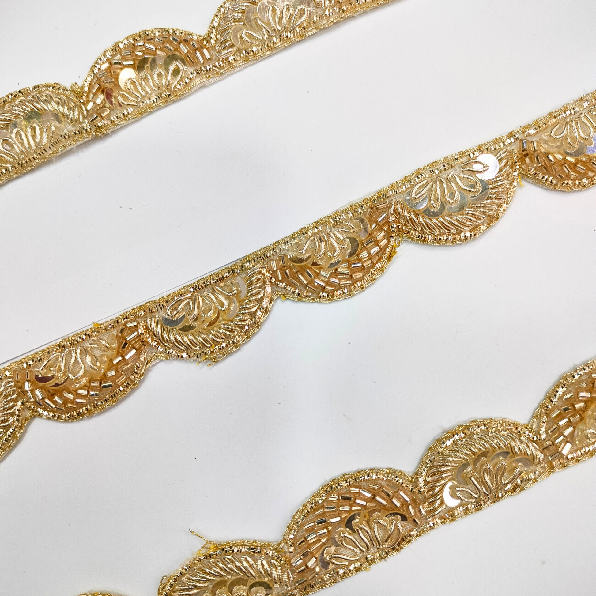 Add a delicate touch of luxury to your creations with our Light Golden Scalloped Trim. This exquisite trim features an elegant scalloped pattern, meticulously crafted in soft light golden thread. The subtle sheen and graceful design make it perfect for accenting sarees, lehengas, dupattas, or home décor, offering a refined, understated elegance. Ideal for weddings, festive occasions, or special couture designs, this Light Golden Scalloped Trim elevates your pieces with a timeless and sophisticated finish.