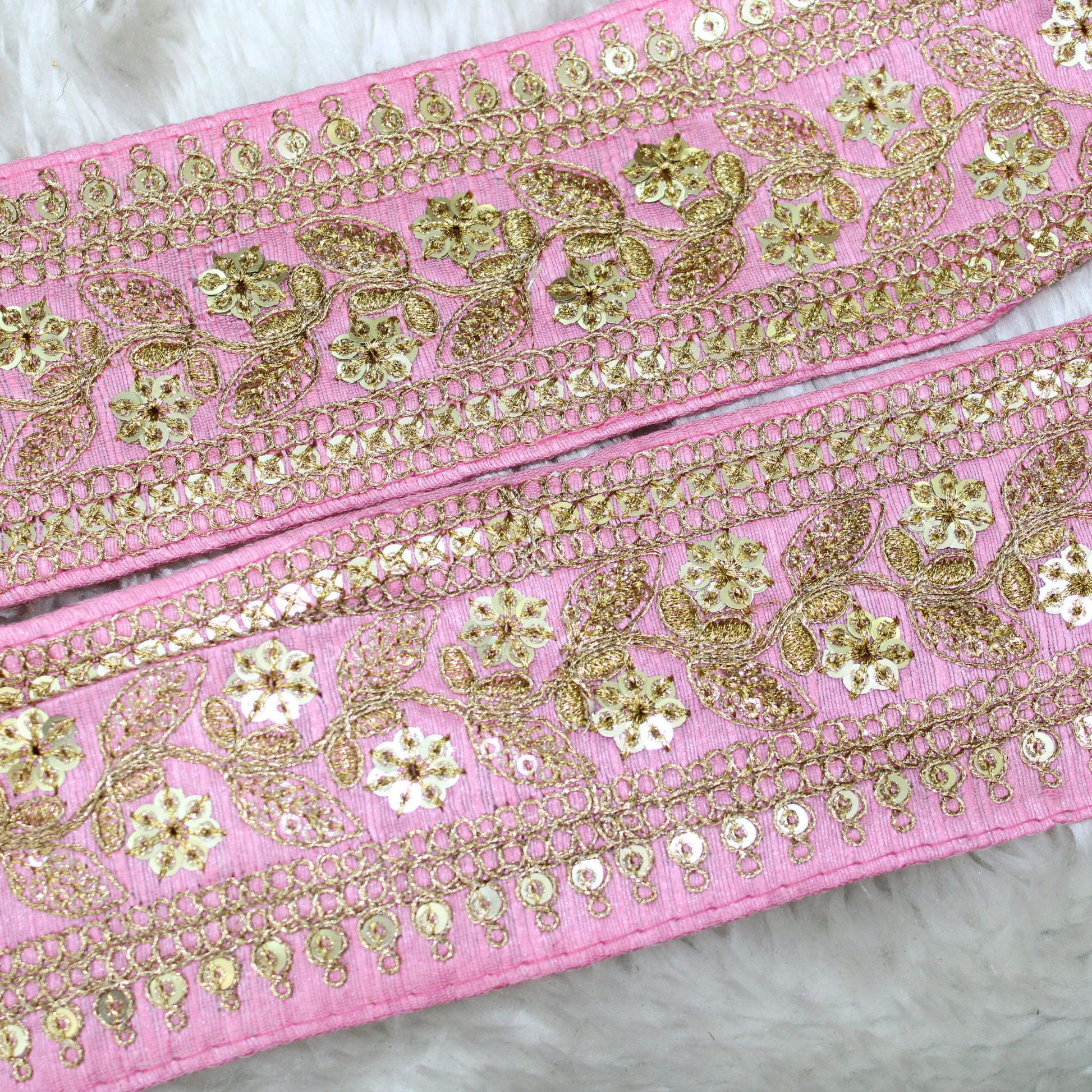 Enhance your creations with this Floral Sequence Zari Trim. Delicately embroidered with floral motifs, it’s embellished with sparkling sequins and metallic zari for a touch of glamour. Perfect for adding a soft, feminine elegance to sarees, lehengas, and accessories. The light pink hue gives it a graceful, romantic appeal. A stunning addition to any couture or craft project.