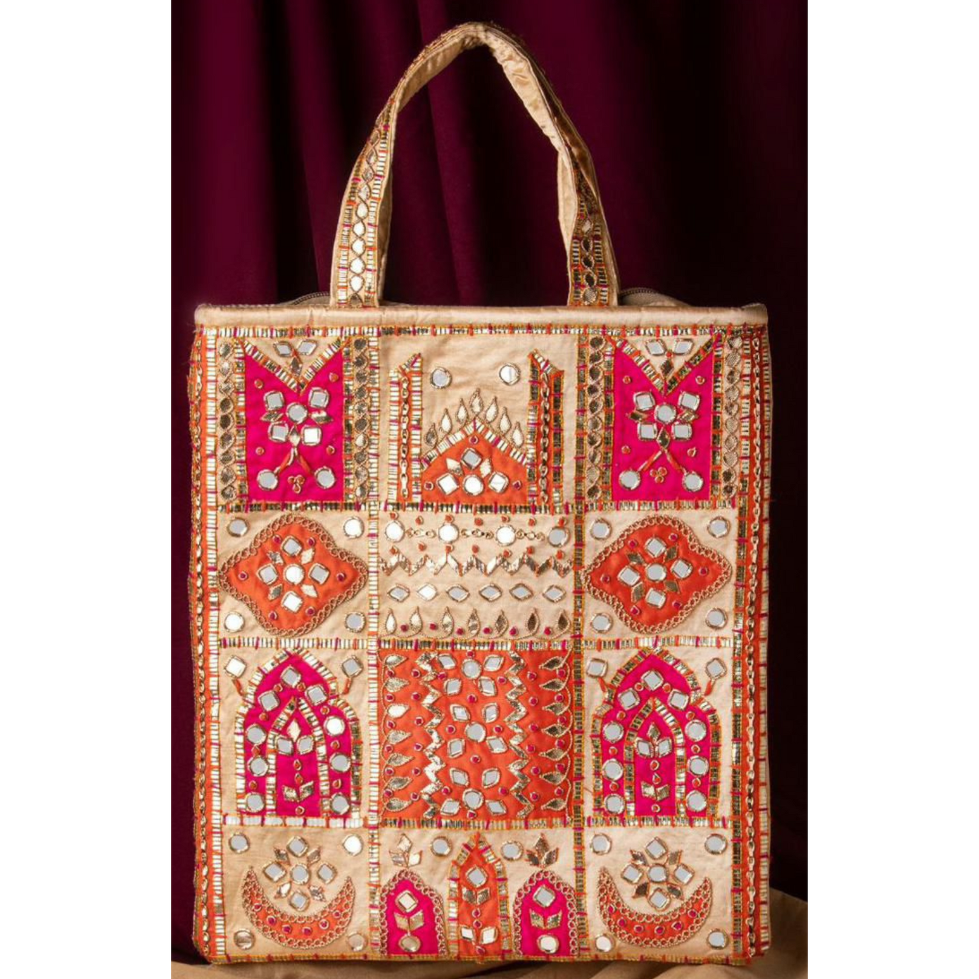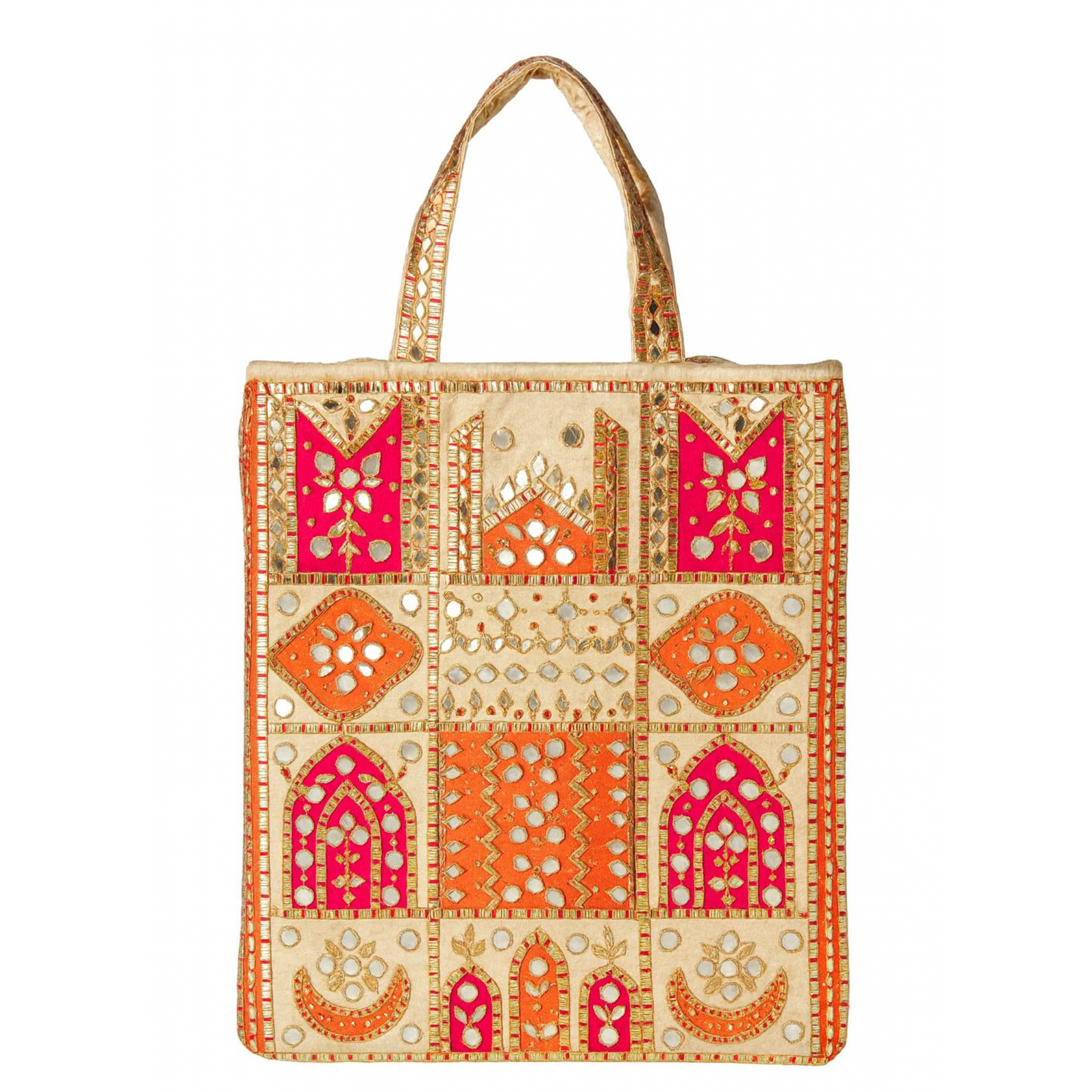 A chic ivory tote bag featuring a minimalist design with scattered mirror work and delicate embroidery. The handcrafted embroidered handles with mirror detailing add a touch of elegance. Spacious and versatile, this tote is perfect for festive occasions, casual ethnic styling, and everyday elegance.