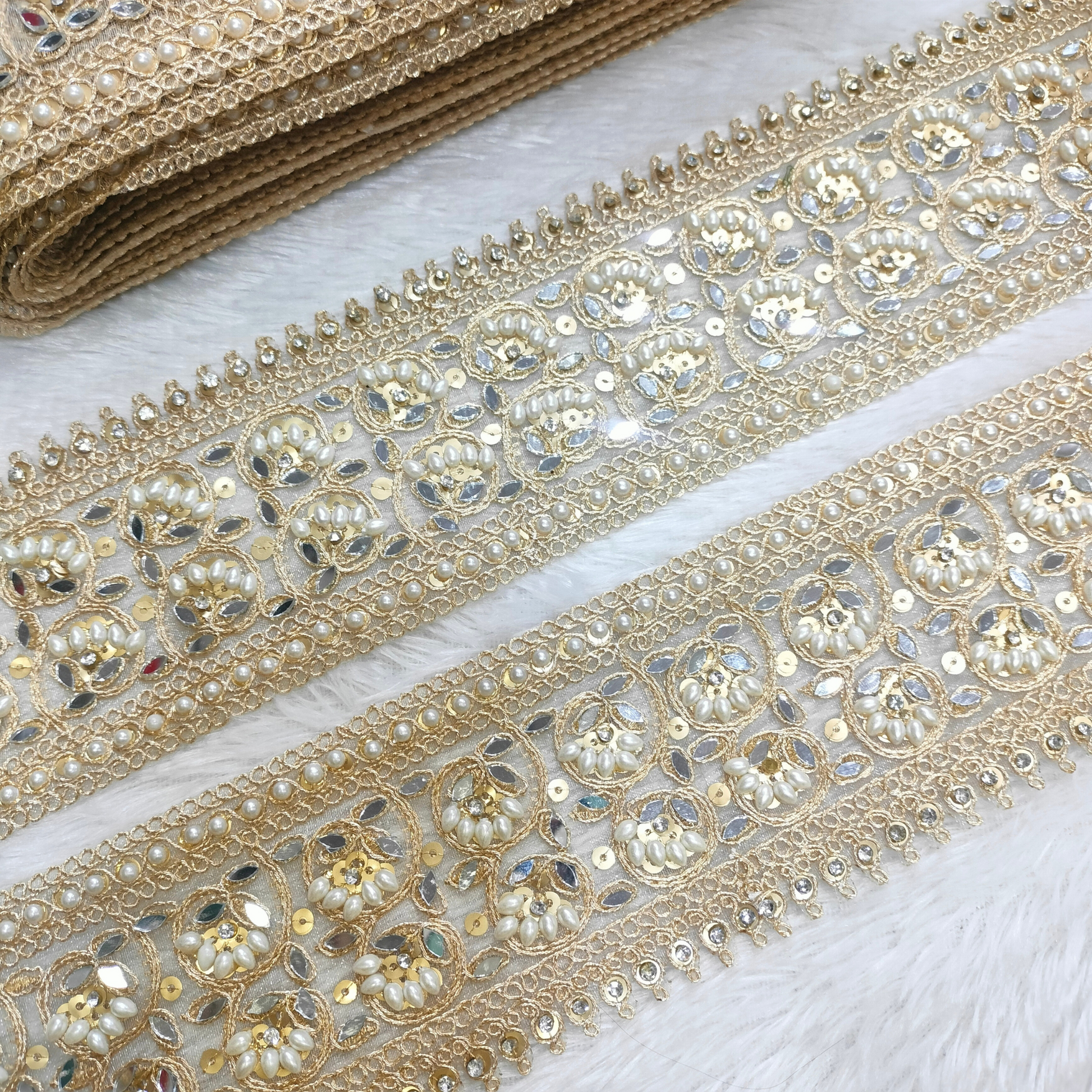 Beautifully designed mirror and pearl trim featuring delicate patterns with embedded reflective mirrors and lustrous pearls. Ideal for adding a rich, festive touch to sarees, lehengas, dupattas, blouses, handbags, and home décor. The combination of sparkling mirrors and elegant pearls creates a perfect balance of tradition and sophistication for weddings, celebrations, and special occasions.