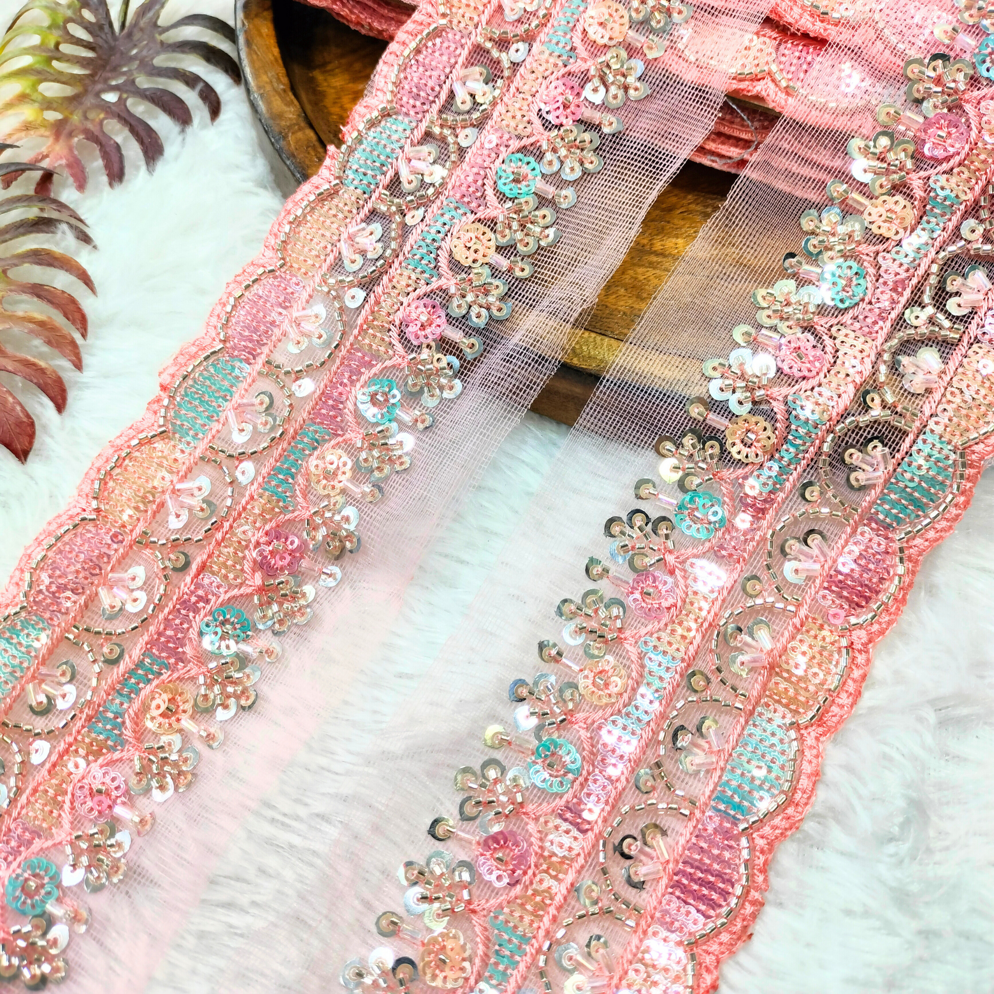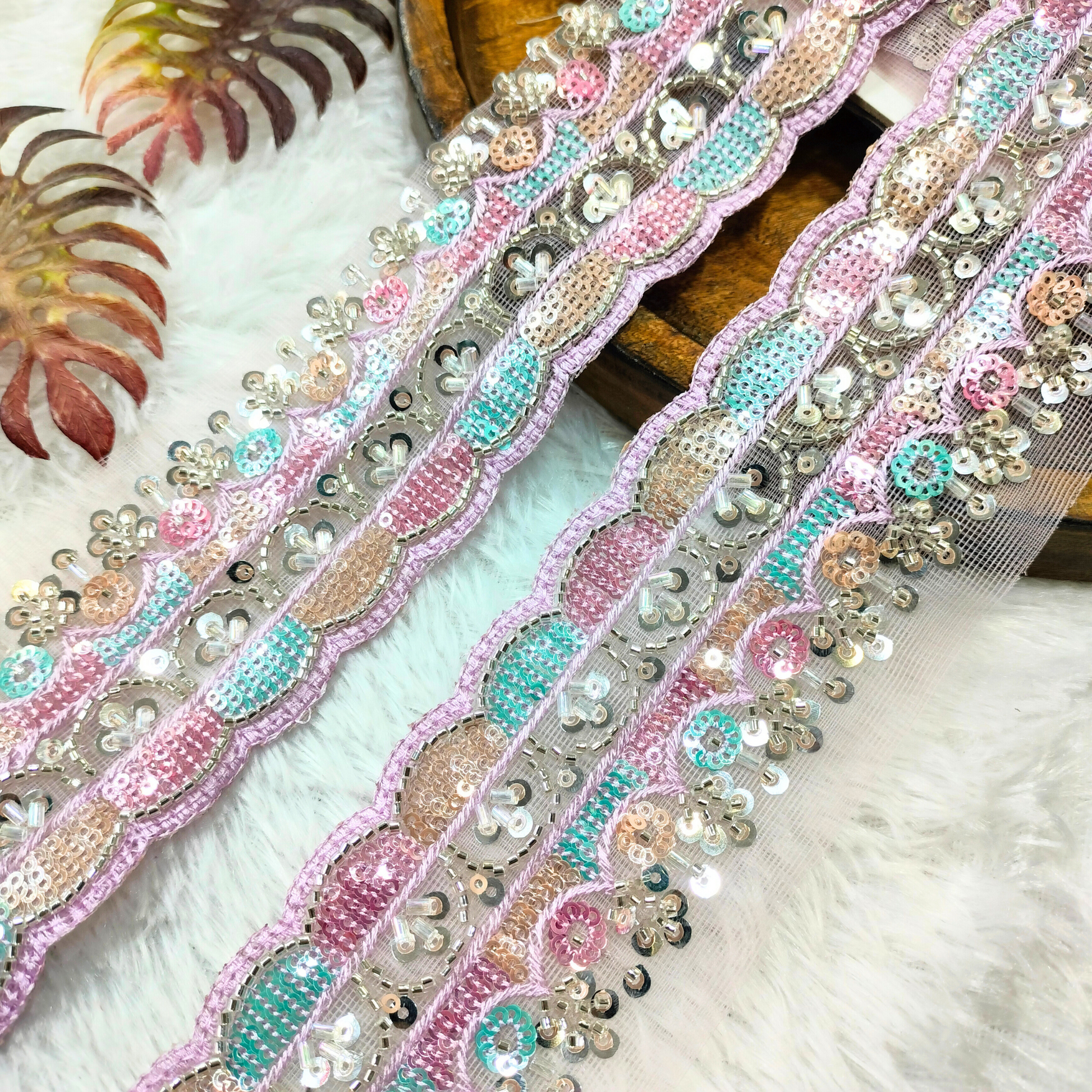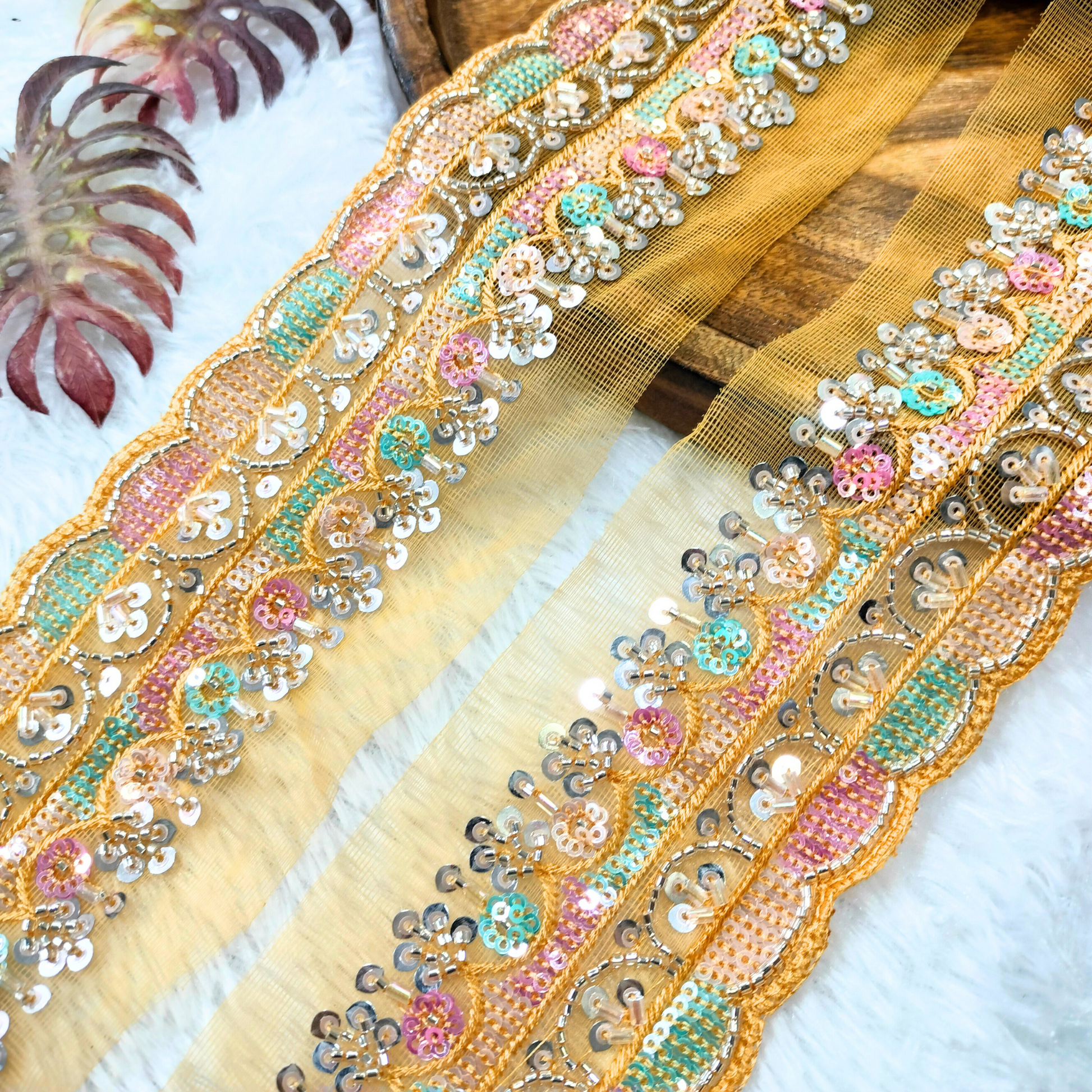 Bold, festive, and full of flair—this multicolor sequin embellished trim is designed to make a statement. Featuring a playful mix of shimmering sequins in vibrant hues, it’s perfect for fusion wear, festive outfits, and standout accessories. Add it to sarees, dupattas, or jackets for a pop of color and a dazzling finish that captures attention with every move.