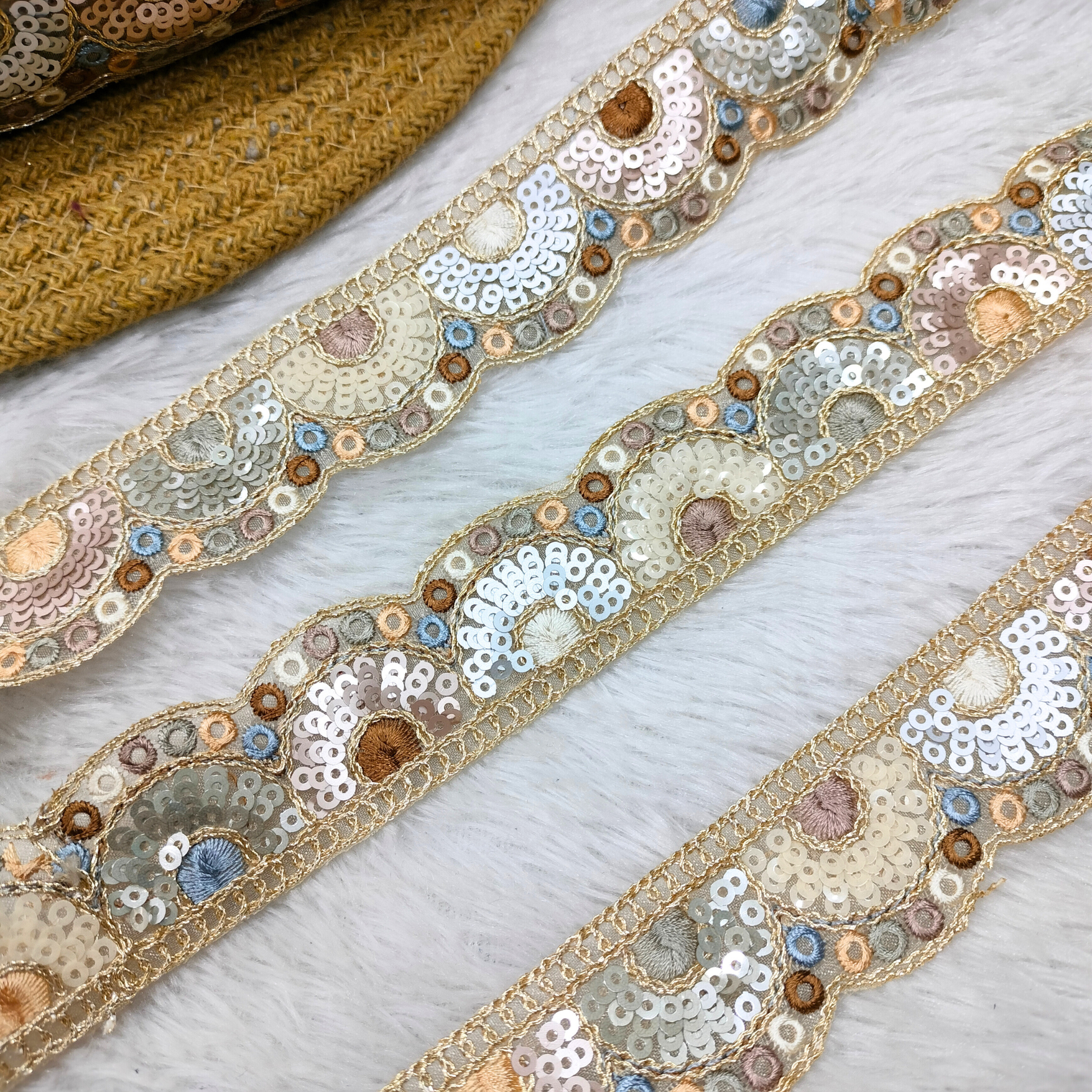 This pastel-toned lace combines soft shades with delicately arranged sequins for a calm, premium look. The smooth scallop pattern adds symmetry and modernity to any outfit. Perfect for contemporary ethnic wear, gowns, and dupattas. Lightweight and elegant, it blends beautifully with subtle color palettes. A refined lace that brings understated charm to your ensembles.
