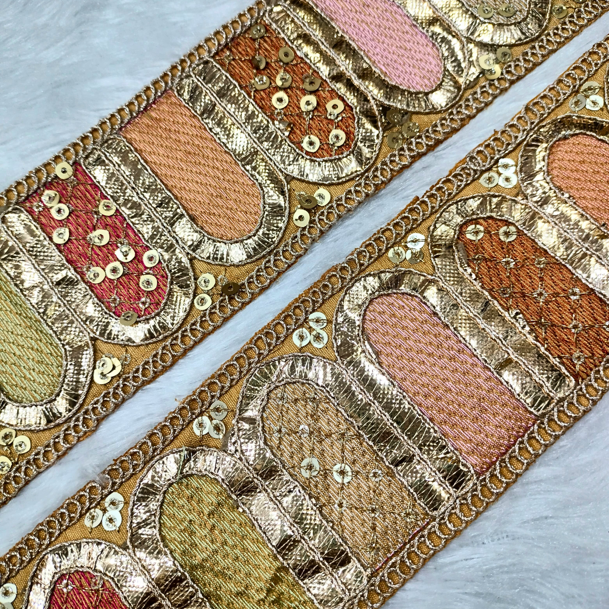 Enhance your designs with the radiant beauty of our Multicolor Embroidery Work Lace. Featuring beautiful multicolor embroidery on a soft peach base, this lace brings a gentle, vibrant touch to any fabric. Whether you're working on sarees, lehengas, dupattas, or home décor, this lace adds a lovely, festive finish, making it perfect for weddings, celebrations, and other special occasions.