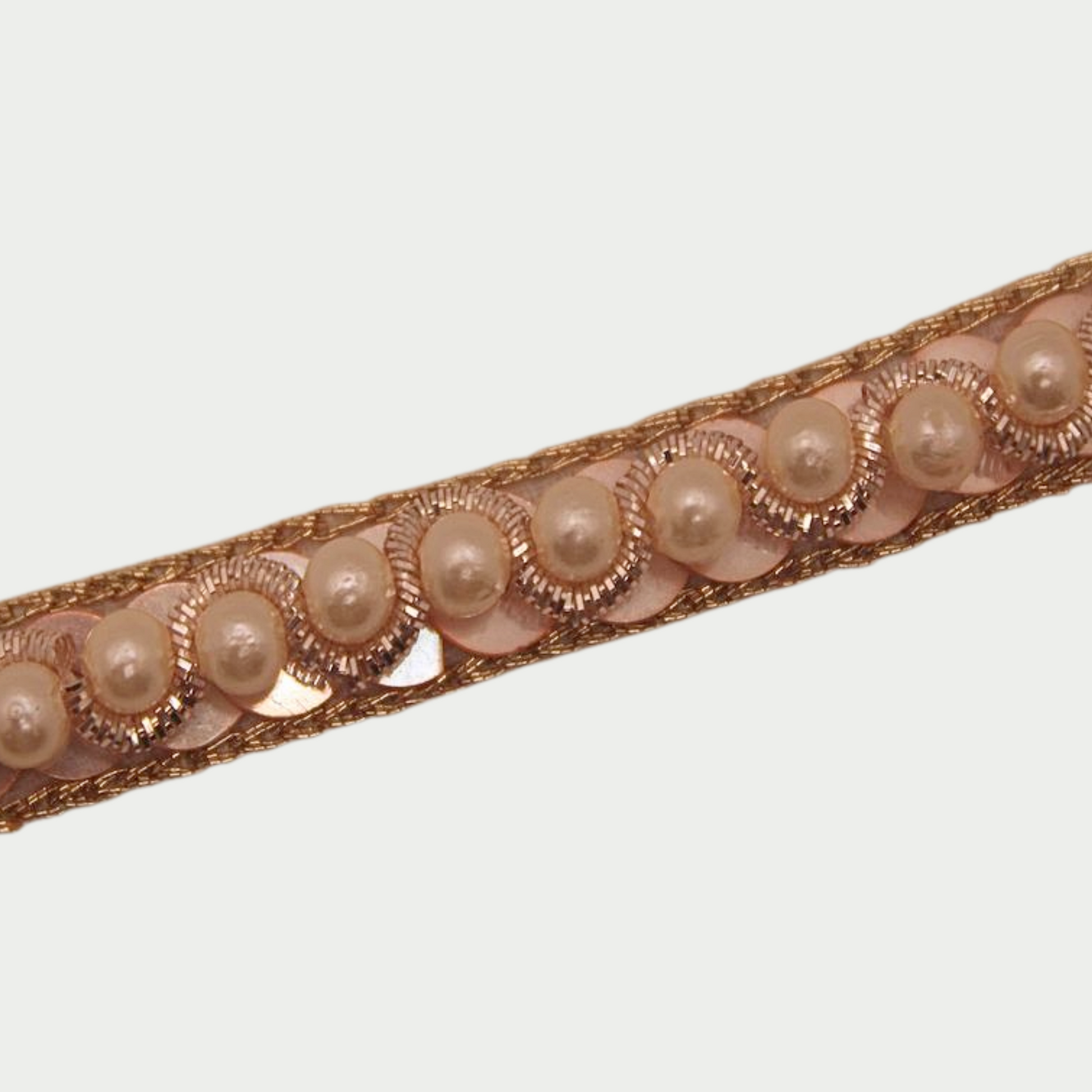 Our Peach Pearl Embellished Handwork Lace & Trim adds an opulent touch with its intricate golden embroidery, meticulously crafted for a refined, luxurious finish. The rich golden threads bring warmth and elegance, perfect for elevating home décor, fashion, or special events. The detailed handwork enhances the design with texture and depth, creating a timeless, sophisticated look. Ideal for adding a touch of glamour and sophistication to any project, this trim exudes luxury and fine craftsmanship. Infuse your creations with the radiant charm and elegance of this golden embellished handwork trim.
