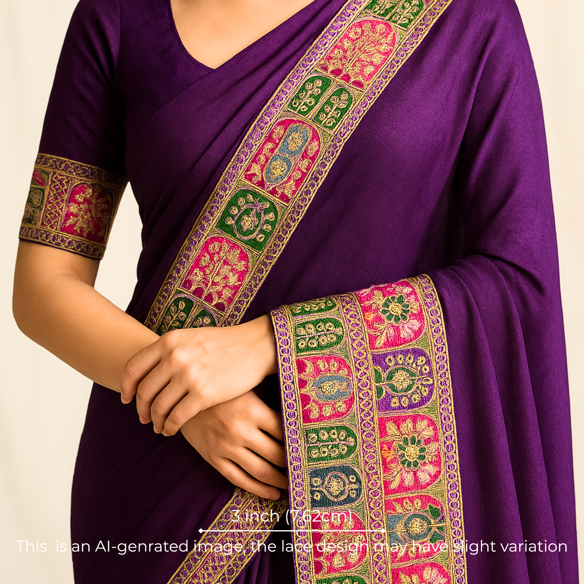 Elevate your creations with our Multicolor Zari Work Lace. This stunning lace features a soft Purple base intricately woven with vibrant multicolor zari threads, creating a beautiful contrast and adding a touch of whimsy. Perfect for enhancing garments, accessories, and home décor, this lace is both versatile and easy to apply.