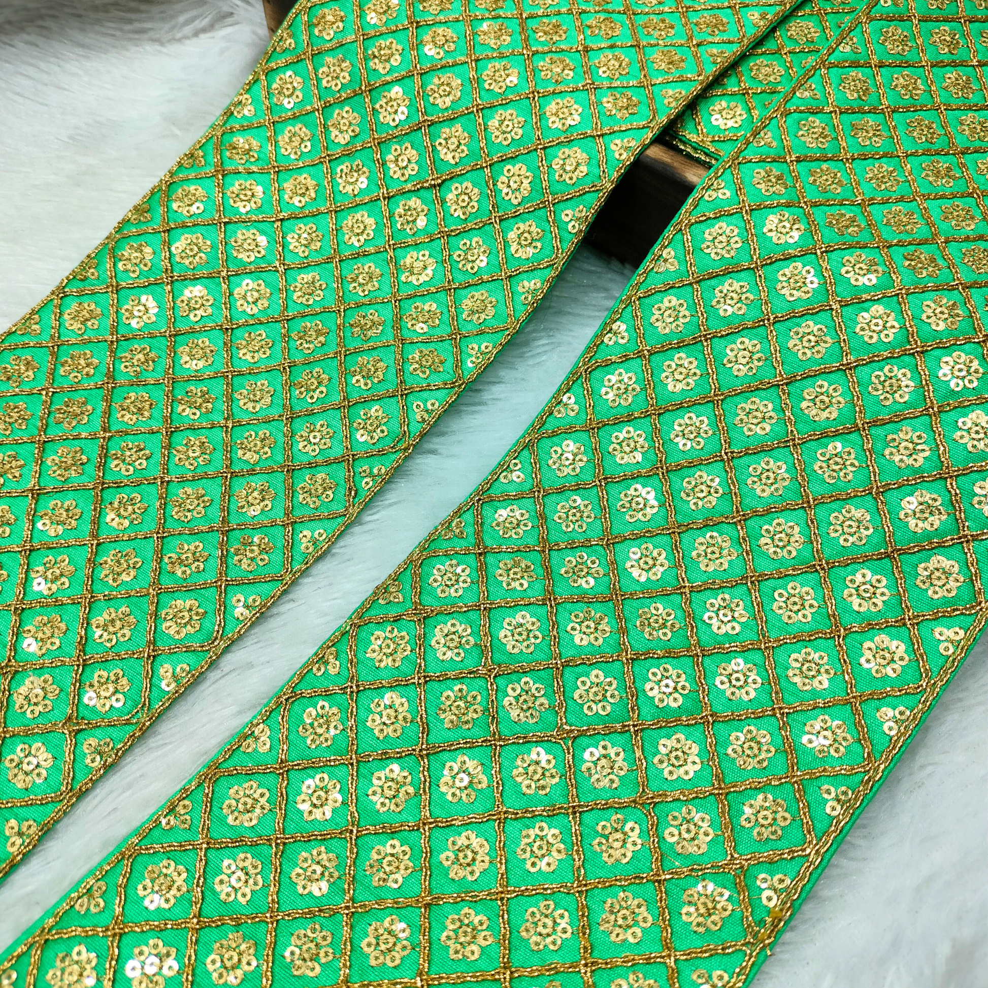 Make a bold statement with this stunning geometric floral sequin lace border, featuring gold-toned flower motifs arranged within diamond grids on a rich base. The combination of intricate zari embroidery and shimmering sequins gives it a luxe appeal, ideal for blouses, sarees, lehenga designs, and fusion fashion. Whether you're styling wedding wear or revamping a festive outfit, this designer lace delivers timeless elegance and high-shine glam.