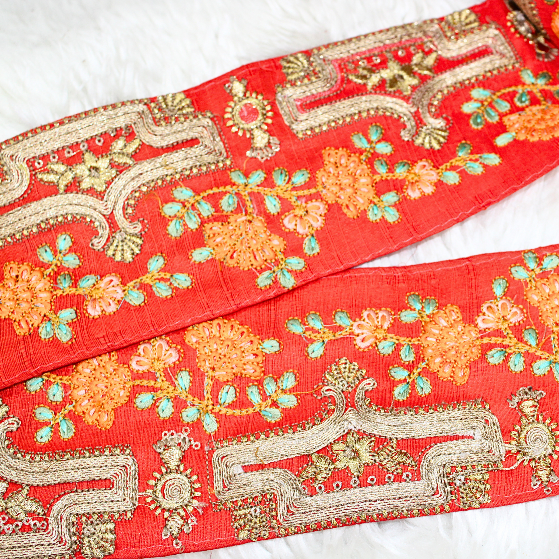 The Red Fancy Zari and Thread Work Embroidered Border features a rich red base adorned with intricate zari and threadwork embroidery. The shimmering metallic zari threads create a beautiful contrast against the bold red, while the detailed threadwork adds texture and elegance. Perfect for enhancing sarees, lehengas, dupattas, and home decor, this border adds a festive and luxurious touch. Ideal for weddings, festivals, and special occasions, it brings a timeless, regal finish to any fabric.