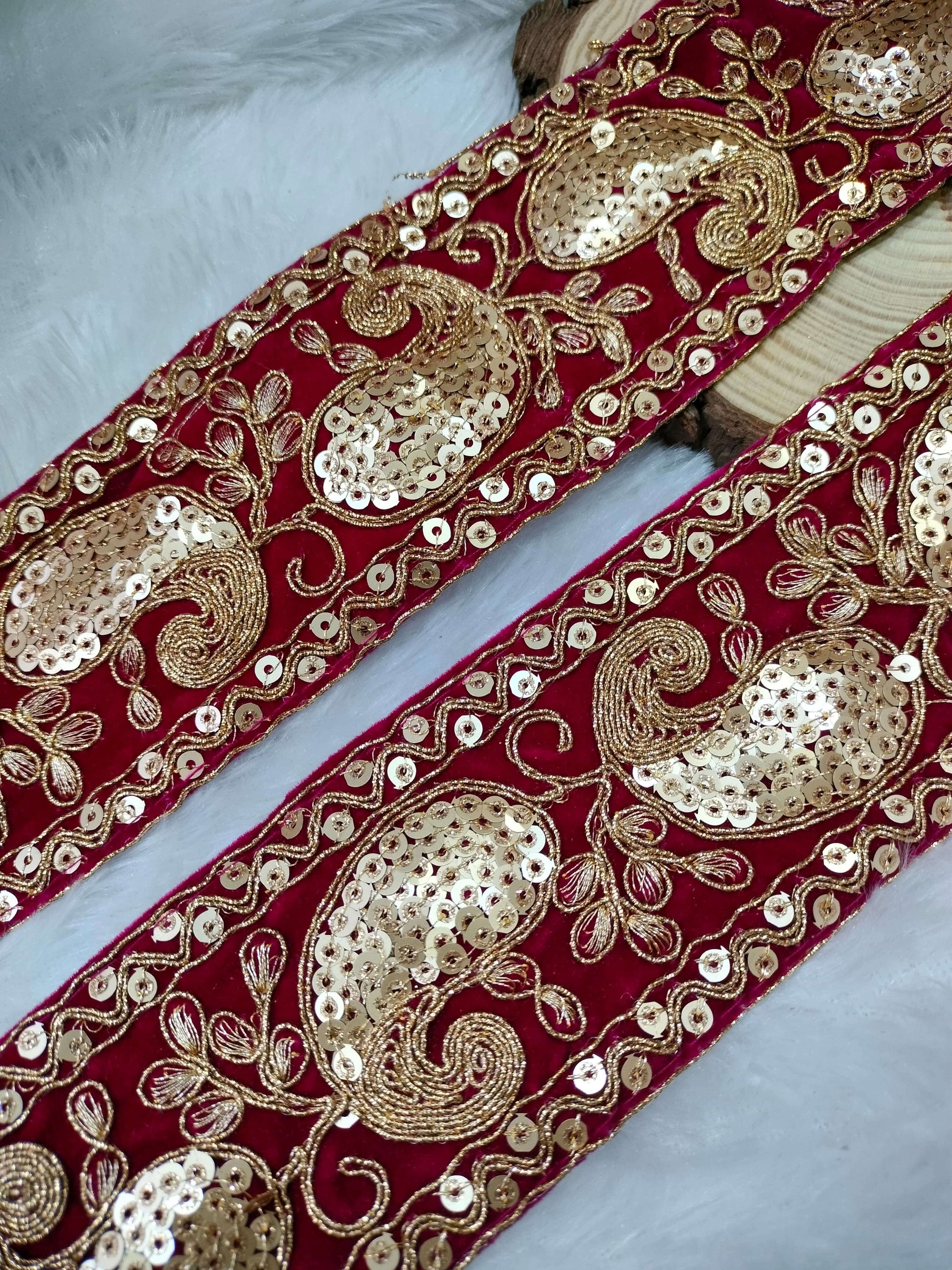 The Fancy Zari and Thread Work Embroidered Border is a beautifully crafted decorative trim, featuring intricate zari (metallic thread) and detailed threadwork embroidery. This combination adds a luxurious and textured finish to any fabric, often used to enhance sarees, lehengas, dupattas, or home decor pieces like cushions and table runners. The zari threads, typically gold or silver, shimmer against the rich color of the base fabric, while the threadwork adds depth and dimension with floral, paisley, or geometric motifs. Perfect for weddings, festive occasions, or special events, this border creates a timeless, elegant look that blends tradition with contemporary style.