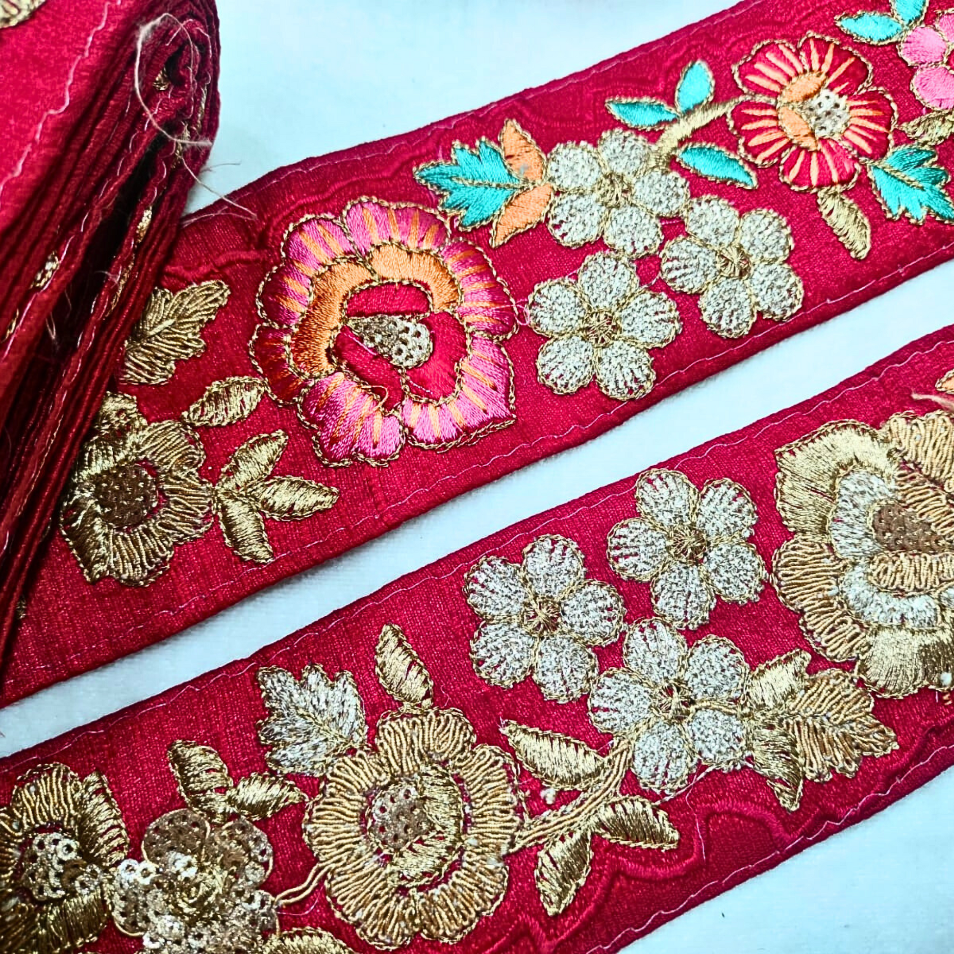Red Fancy Zari and Thread Work Embroidered Border