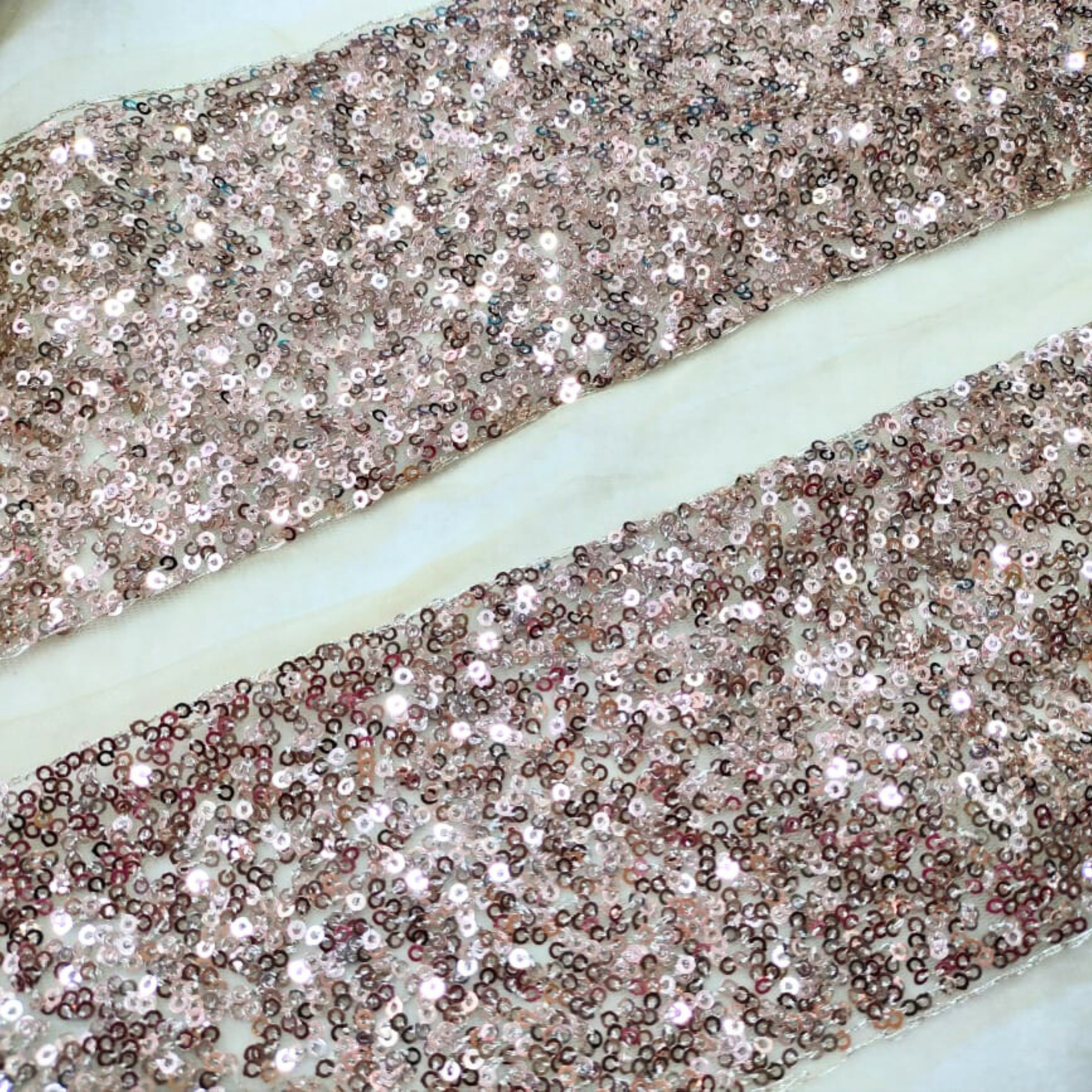 Infuse your projects with elegance using our Fancy Sequin Work Trim. Adorned with shimmering rose gold sequins, this trim adds a touch of luxury and sophistication to any creation. Perfect for enhancing garments, accessories, or home decor, its warm hue offers a chic and trendy flair. Crafted from high-quality materials, this trim ensures durability while delivering a stunning finish. Elevate your designs with this exquisite embellishment today!