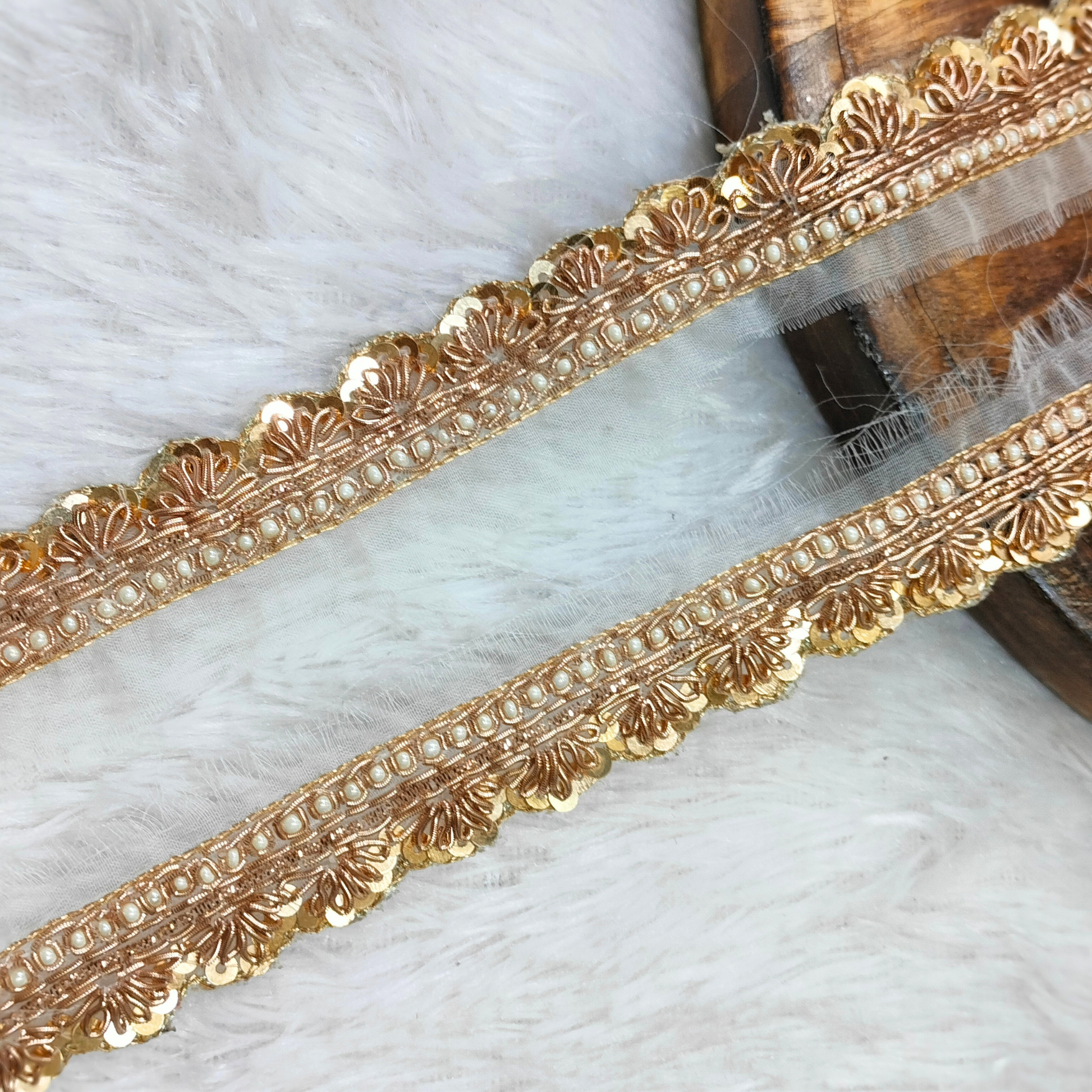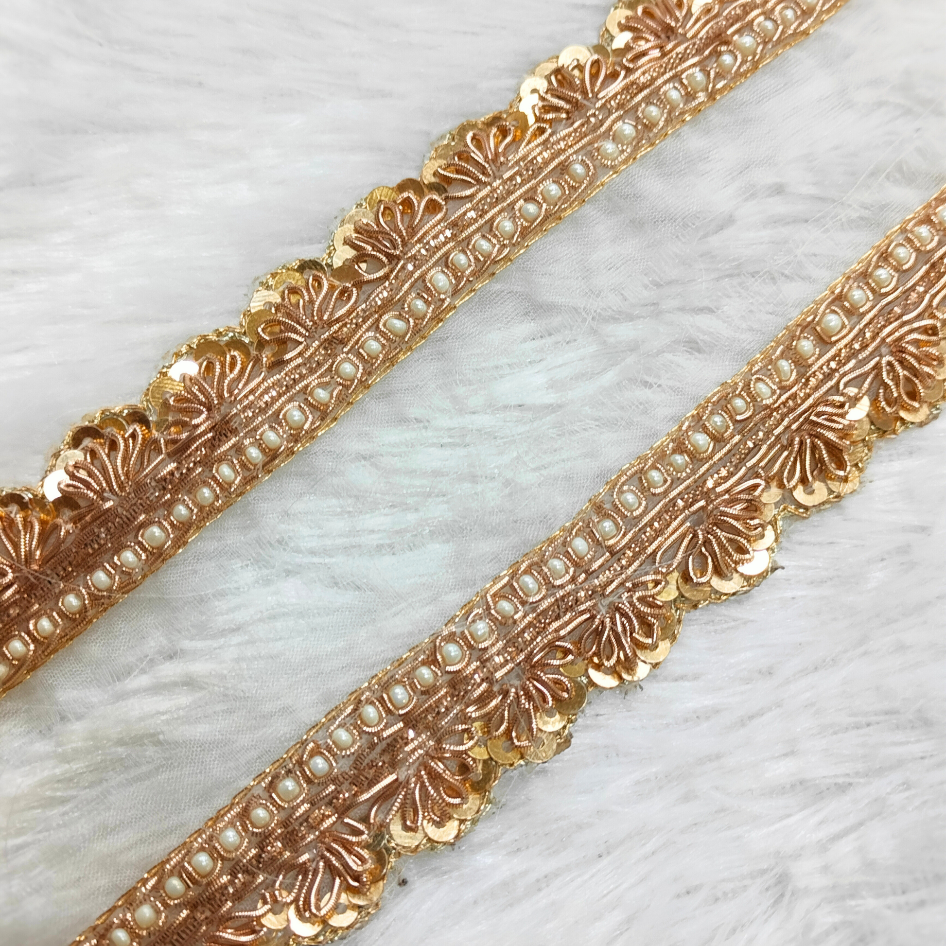 Add a trendy elegance with this rose gold scallop lace border crafted with zari embroidery and pearls. Its shimmer tone makes it ideal for modern sarees, bridal lehengas, dupattas, and gowns. The scallop design gives a graceful edge, enhancing both heavy and light fabrics. Highly preferred by boutiques, designers, and bridal wear makers, this lace brings luxury to any garment. Also suitable for DIY crafts and wedding décor. Available in bulk roll lengths for wholesalers.