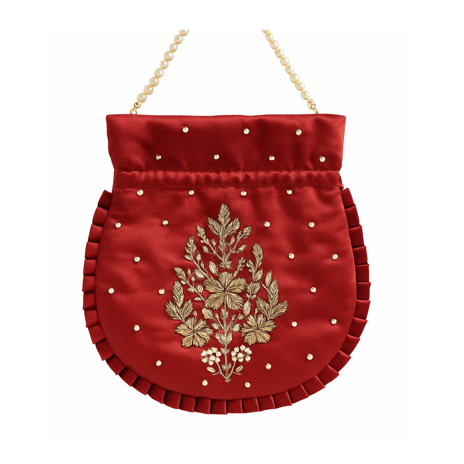 Handcrafted in deep ruby red silk, this potli is adorned with golden floral motifs and delicate pearl accents. The embroidery exudes traditional richness, making it a perfect bridal and festive accessory. Lightweight and elegant, it blends practicality with ethnic style. Designed to complement heavy lehengas and sarees effortlessly. A handcrafted wedding potli bag with timeless appeal.