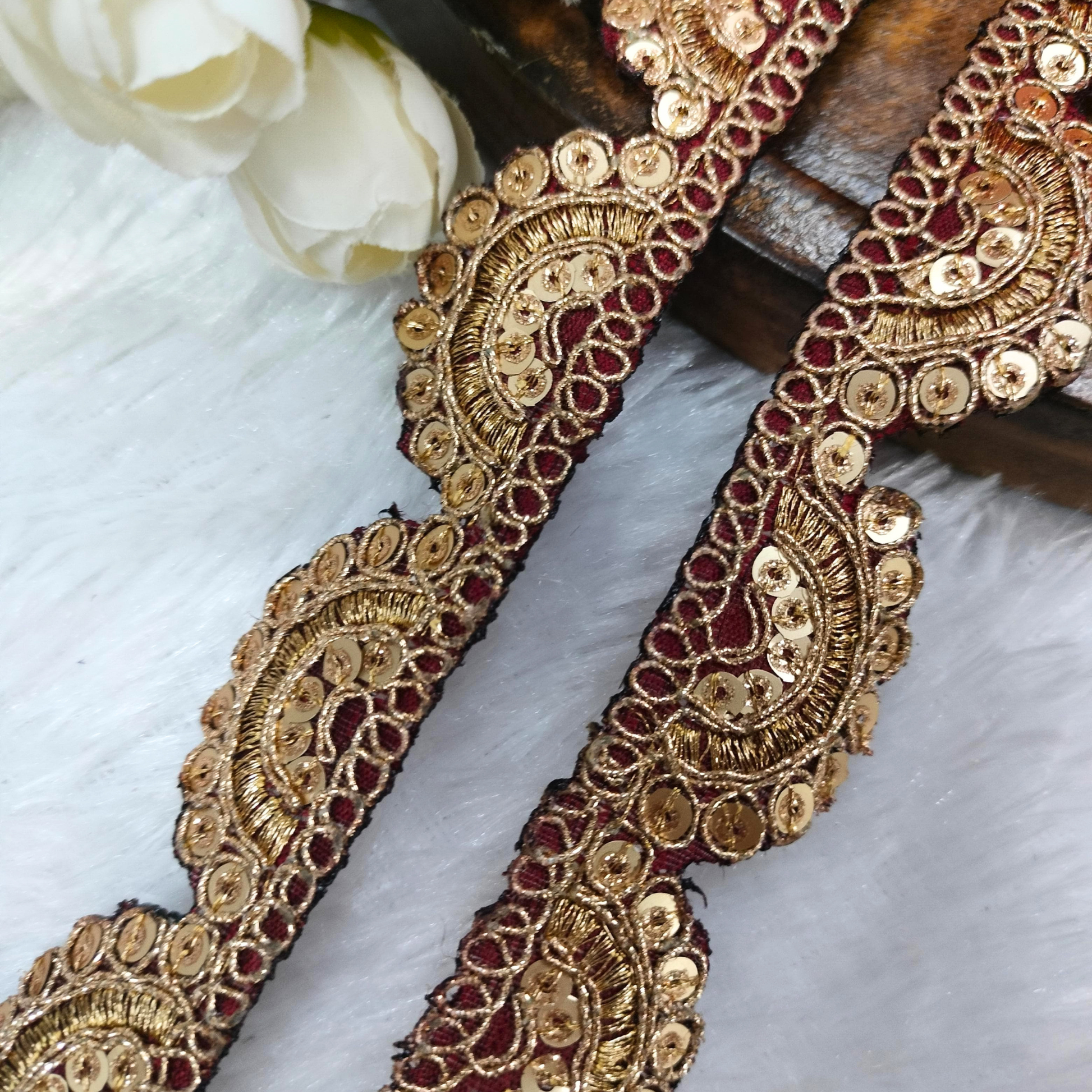 Add vintage elegance to your festive ensembles with this Sequin Half-Moon Lace. Featuring intricate zari embroidery in semi-circular patterns, highlighted with sparkling golden sequins, this lace exudes a regal, handcrafted charm. Perfect for borders of sarees, lehengas, dupattas, and festive decor elements.