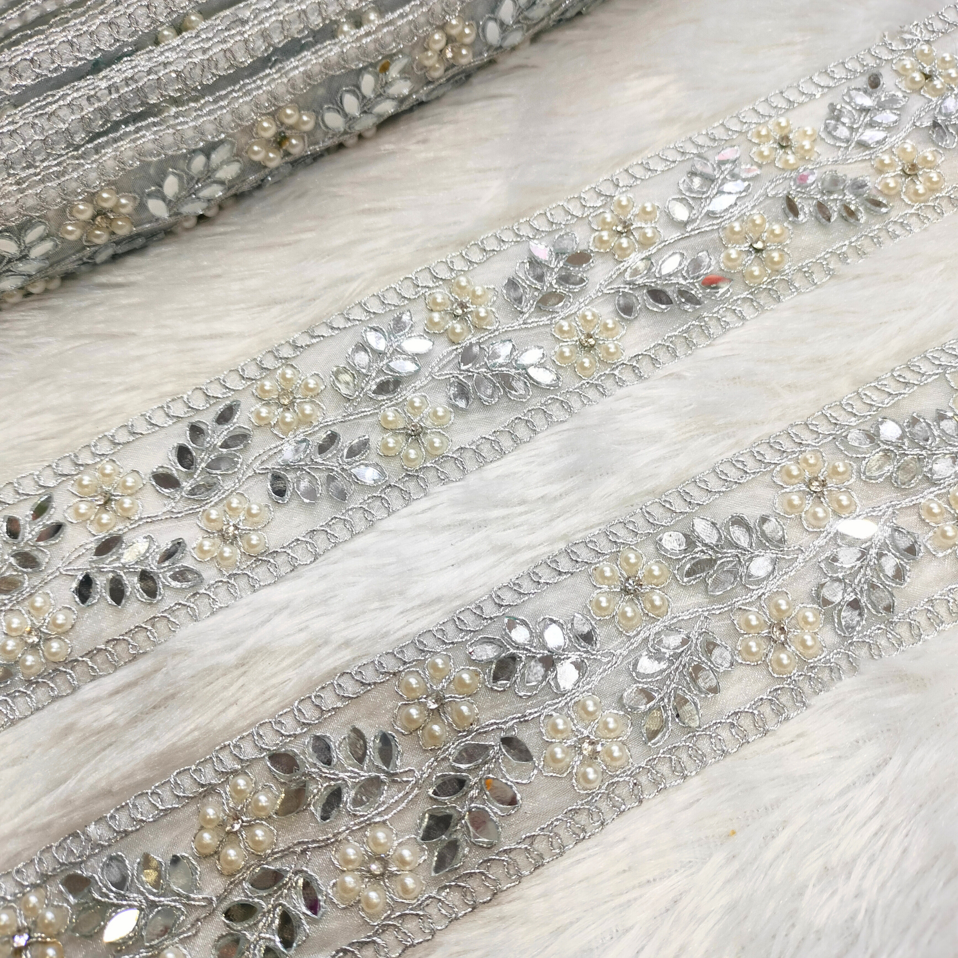 Add a festive sparkle to your designs with this elegant mirror lace trim, featuring intricate patterns with embedded reflective mirrors. Perfect for enhancing sarees, lehengas, dupattas, kurtis, handbags, and home décor. The mirrors catch and reflect light beautifully, giving your creations a vibrant and traditional touch for weddings, festivals, and special occasions.