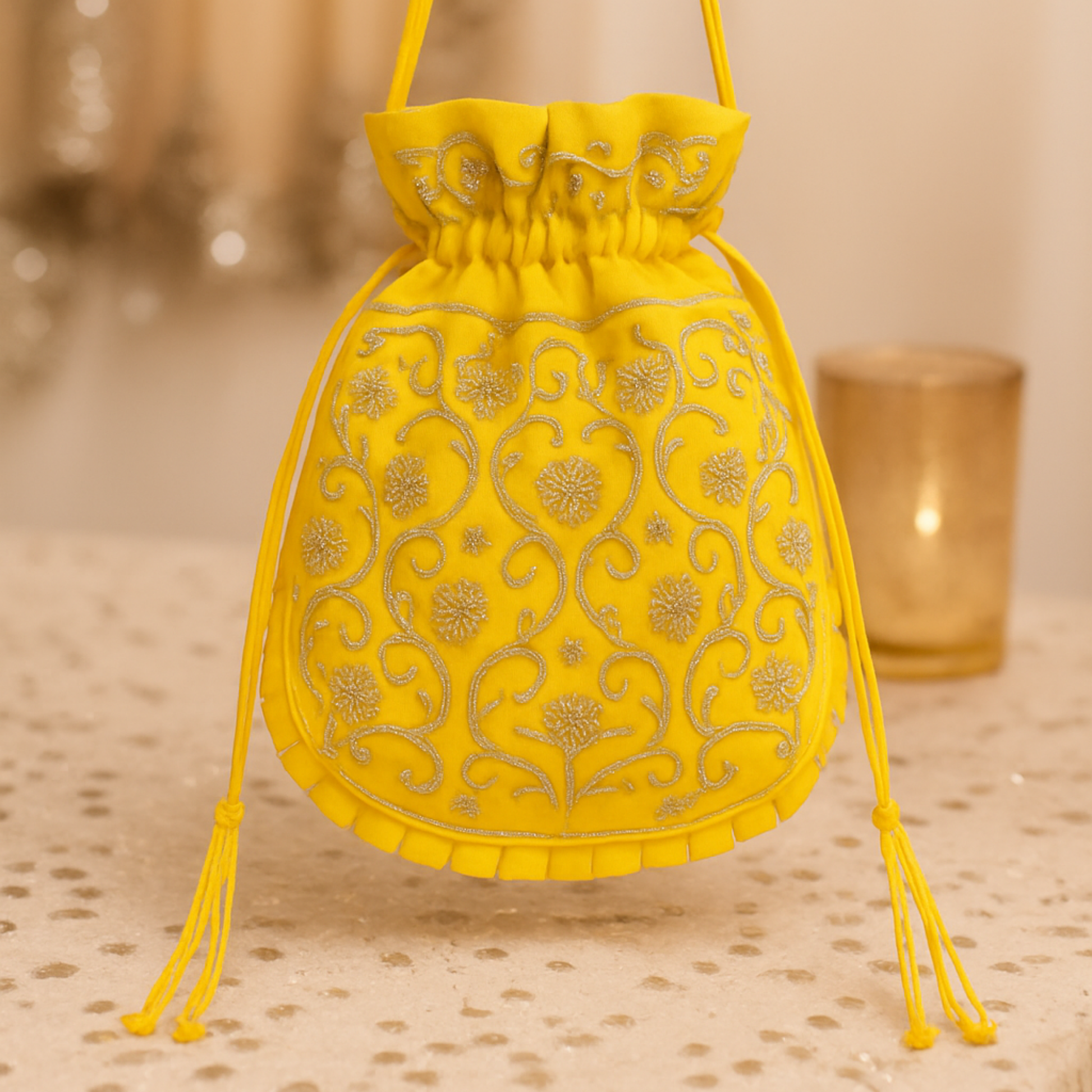 Bright and cheerful, this handcrafted yellow silk potli features silver thread embroidery and sequins that radiate vibrance. Perfect for Haldi, Mehendi, and festive celebrations, it adds a lively charm to your ethnic outfits. Lightweight yet detailed, it combines tradition with a trendy touch. Designed with intricate craftsmanship, it’s a statement accessory for weddings. A handcrafted wedding potli bag that stands out.