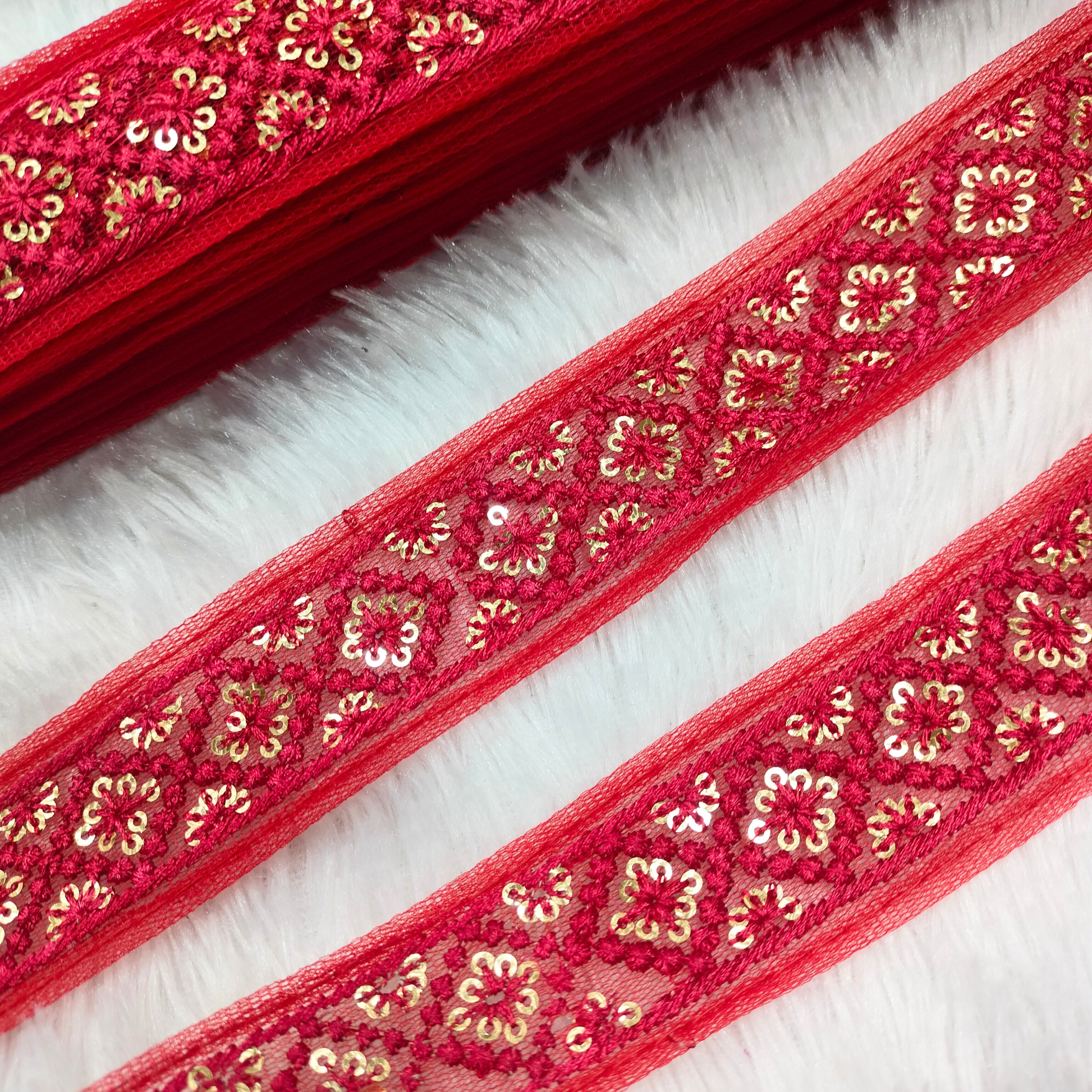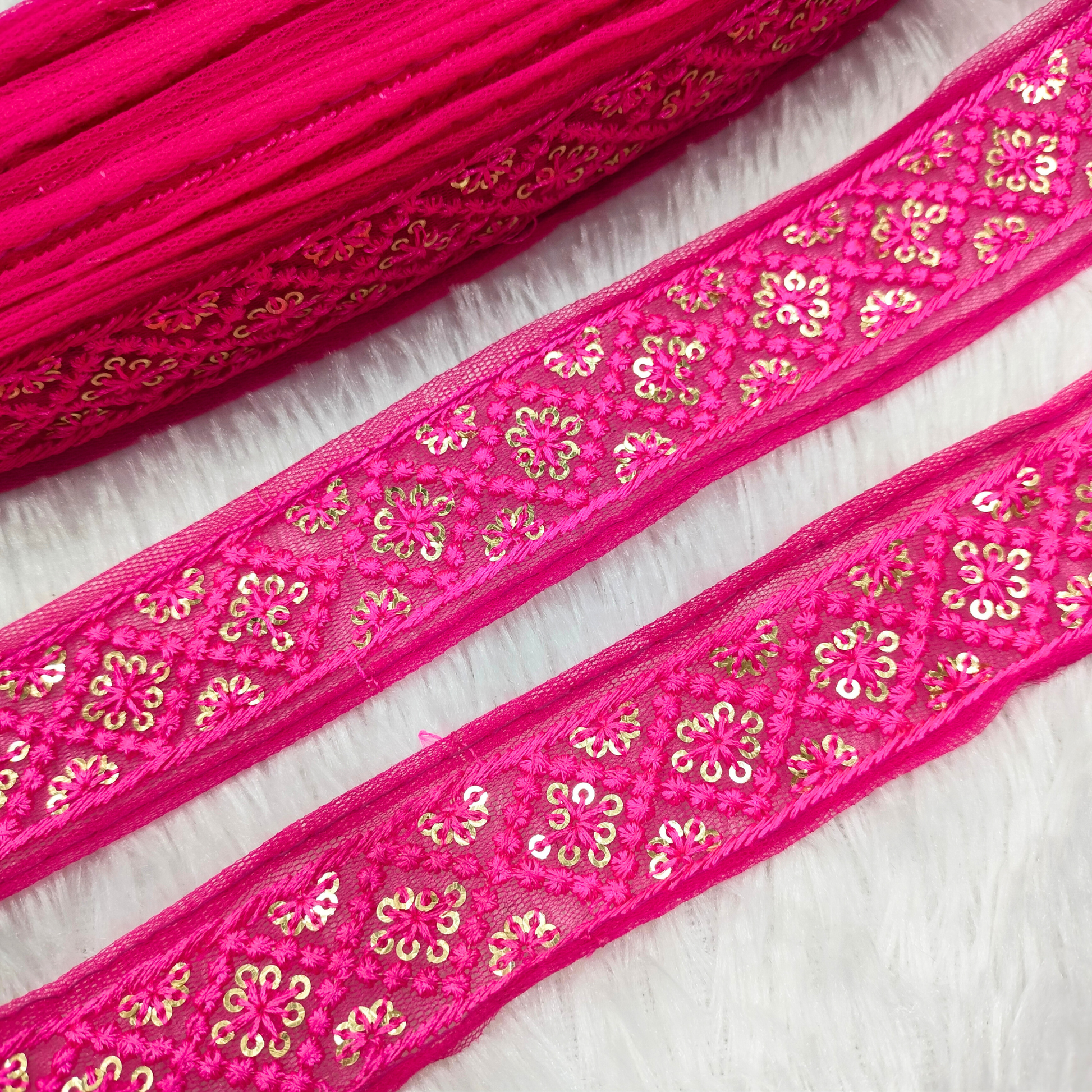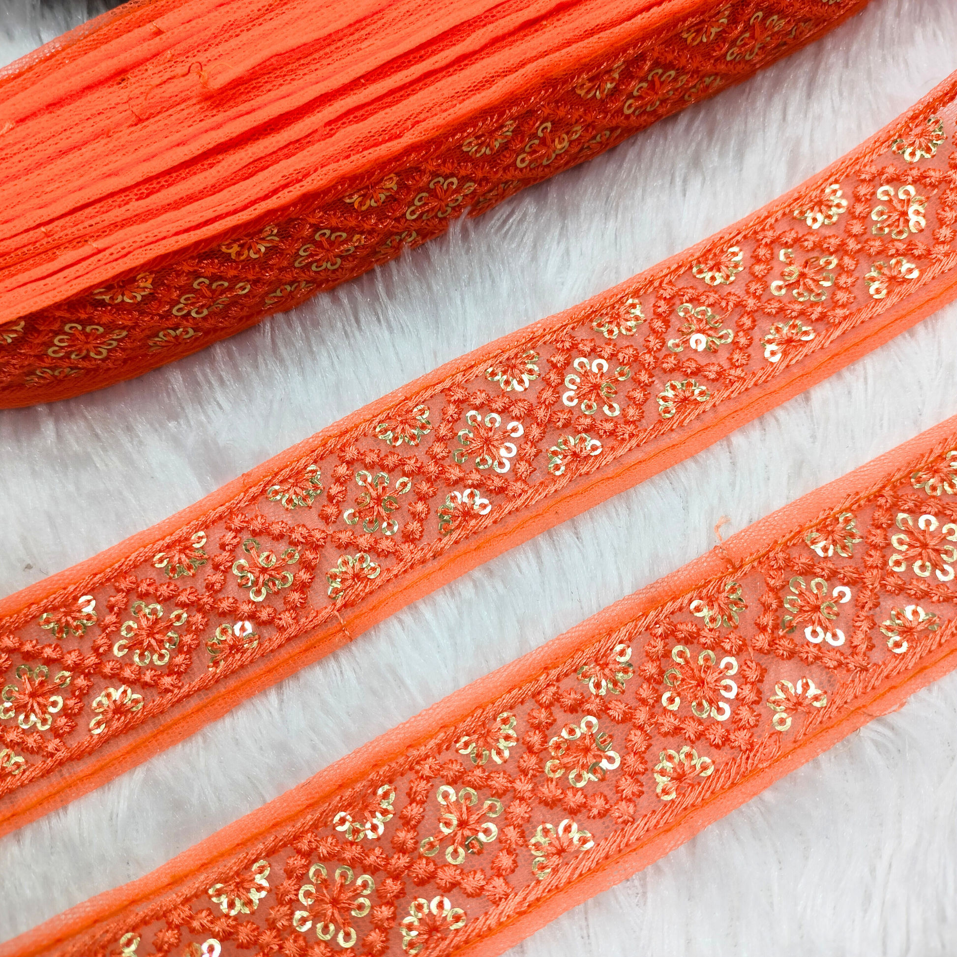 Add a luxurious edge to your creations with this net base lace, beautifully adorned with gold geometric floral motifs and sequins. Its elegant contrast and detailed craftsmanship make it perfect for festive and evening wear.