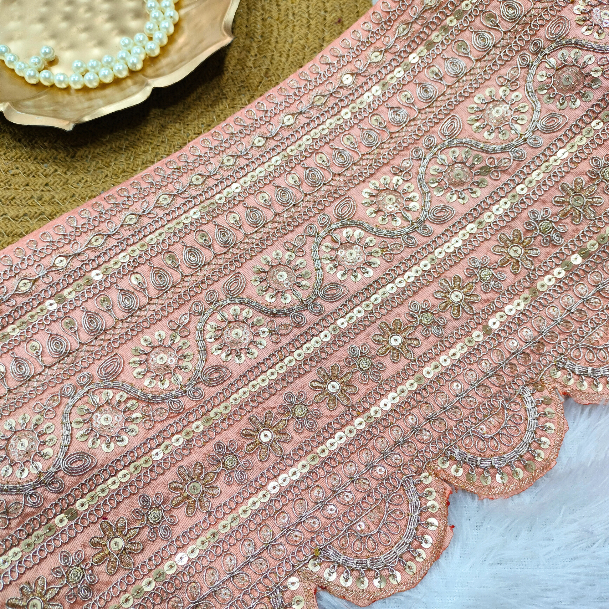 This grand scalloped lace features dense embroidery, shimmering embellishments, and intricate motifs arranged in beautifully repeating patterns. The scalloped edge adds a signature couture-style finish that looks stunning on dupattas, lehengas, and statement blouses. Its rich detailing makes it a perfect choice for bridal couture and premium festive garments. Despite the heavy look, the lace remains soft and easy to work with, ensuring a graceful drape. Ideal for designers who want a regal and luxurious border that instantly transforms any outfit.