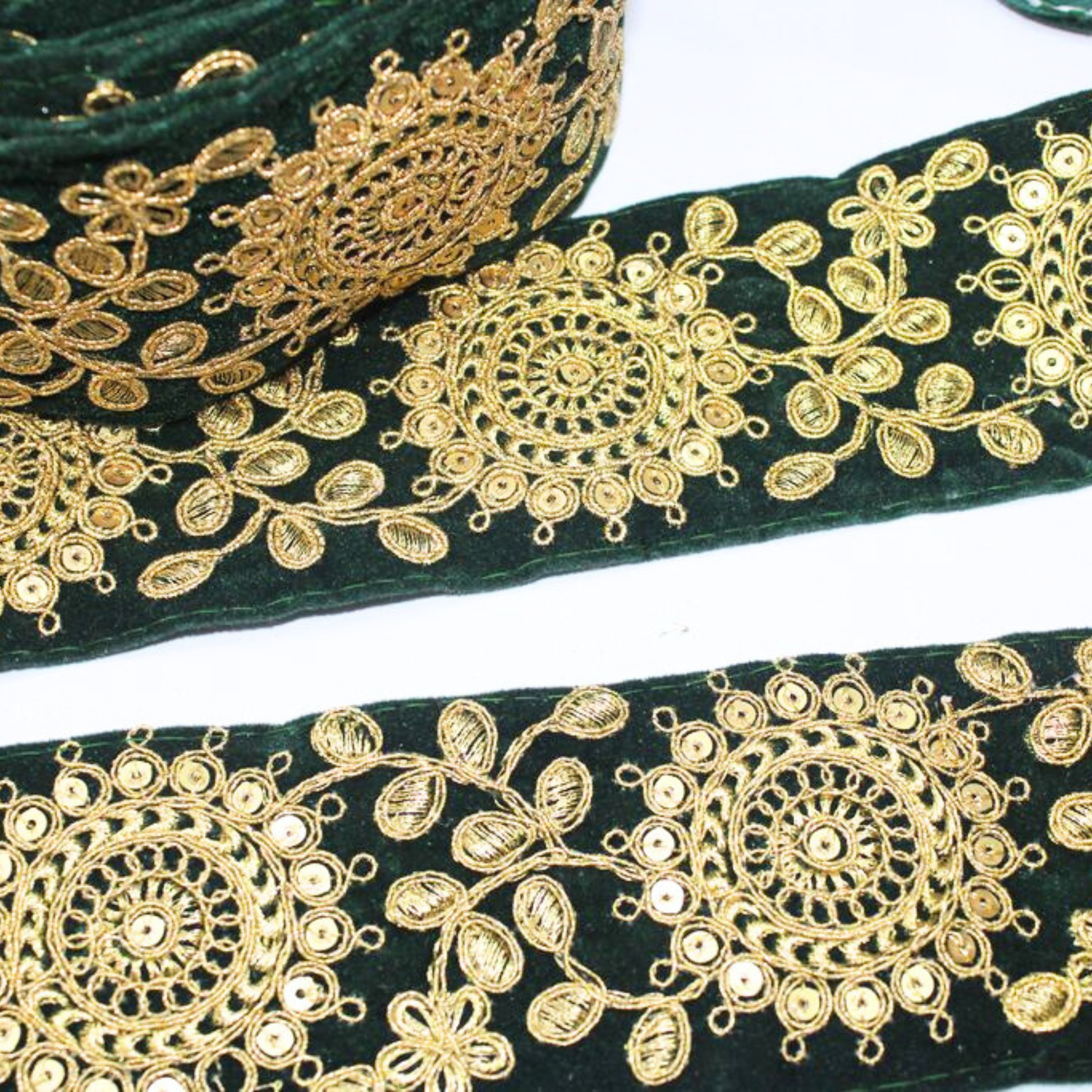 A rich and elegant lace crafted on a soft velvet base, beautifully detailed with intricate embroidery and shimmering sequins. The plush texture of the velvet paired with fine metallic accents adds a luxurious touch to any outfit or décor piece. Perfect for ethnic wear, festive ensembles, and home embellishments.