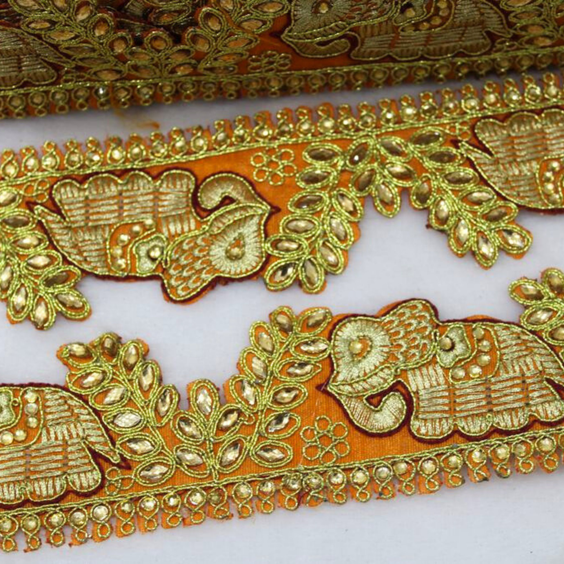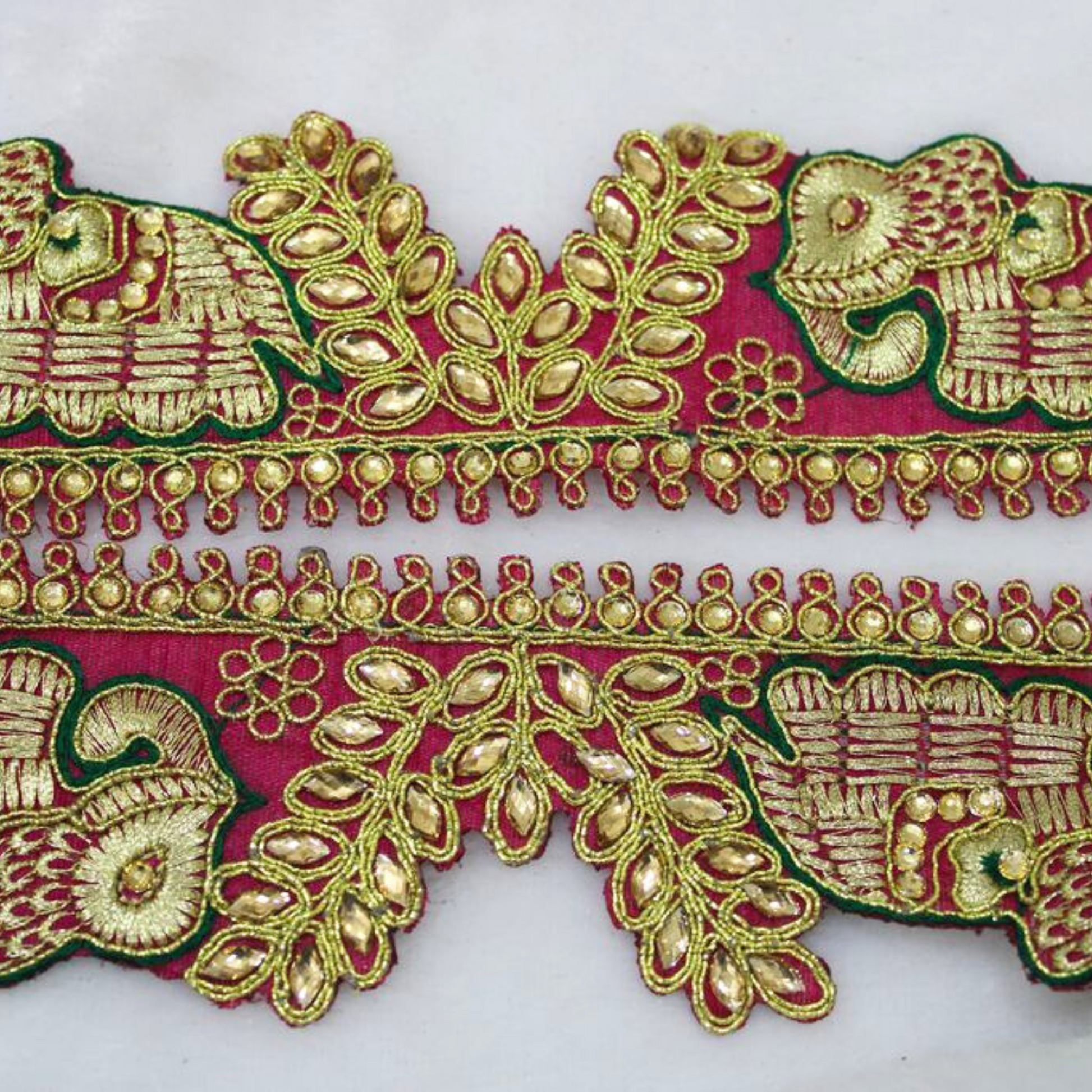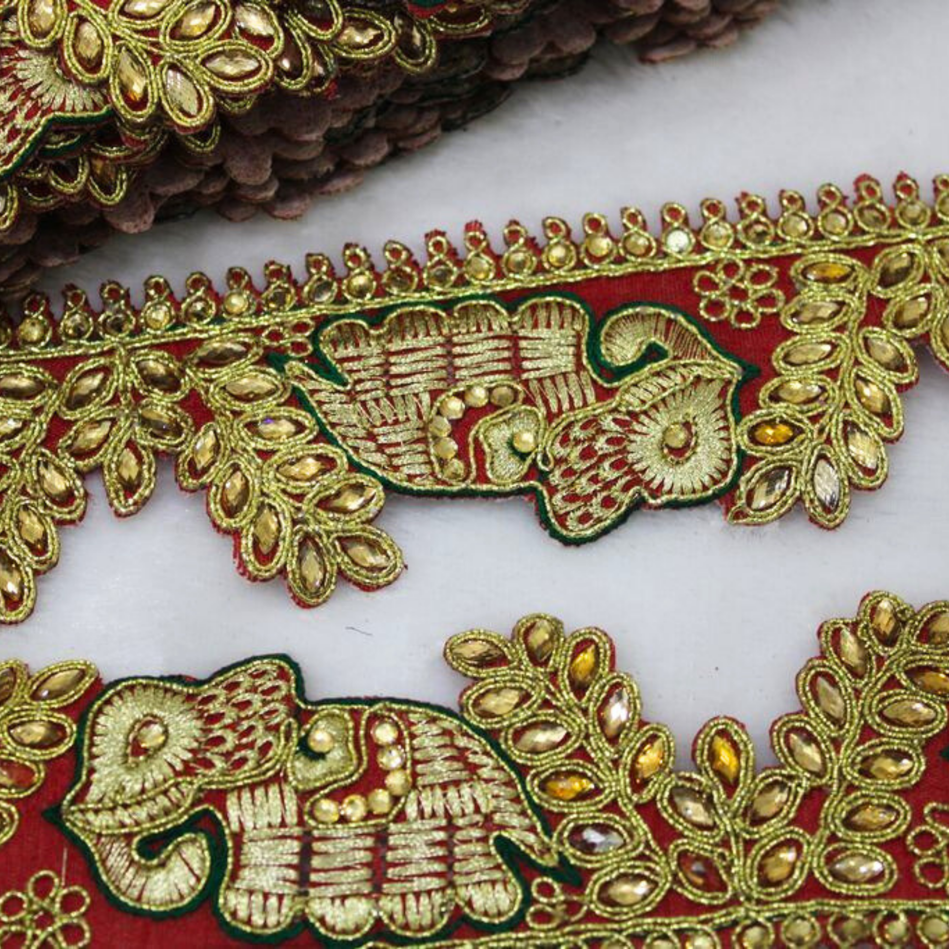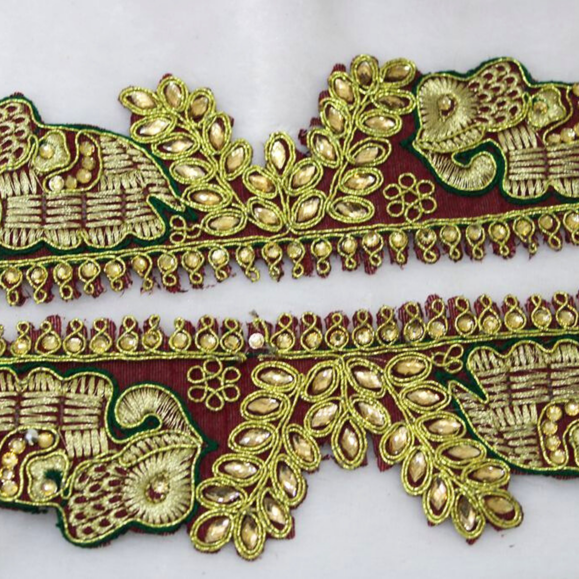 The Elephant Zari and Stone Lace Trim features intricate zari work and vibrant stone accents, beautifully highlighting an eye-catching elephant motif. Perfect for enhancing sarees, lehengas, and ethnic wear, this striking trim adds a bold touch of elegance and cultural flair to any garment. Ideal for designers and tailors seeking standout embellishments.