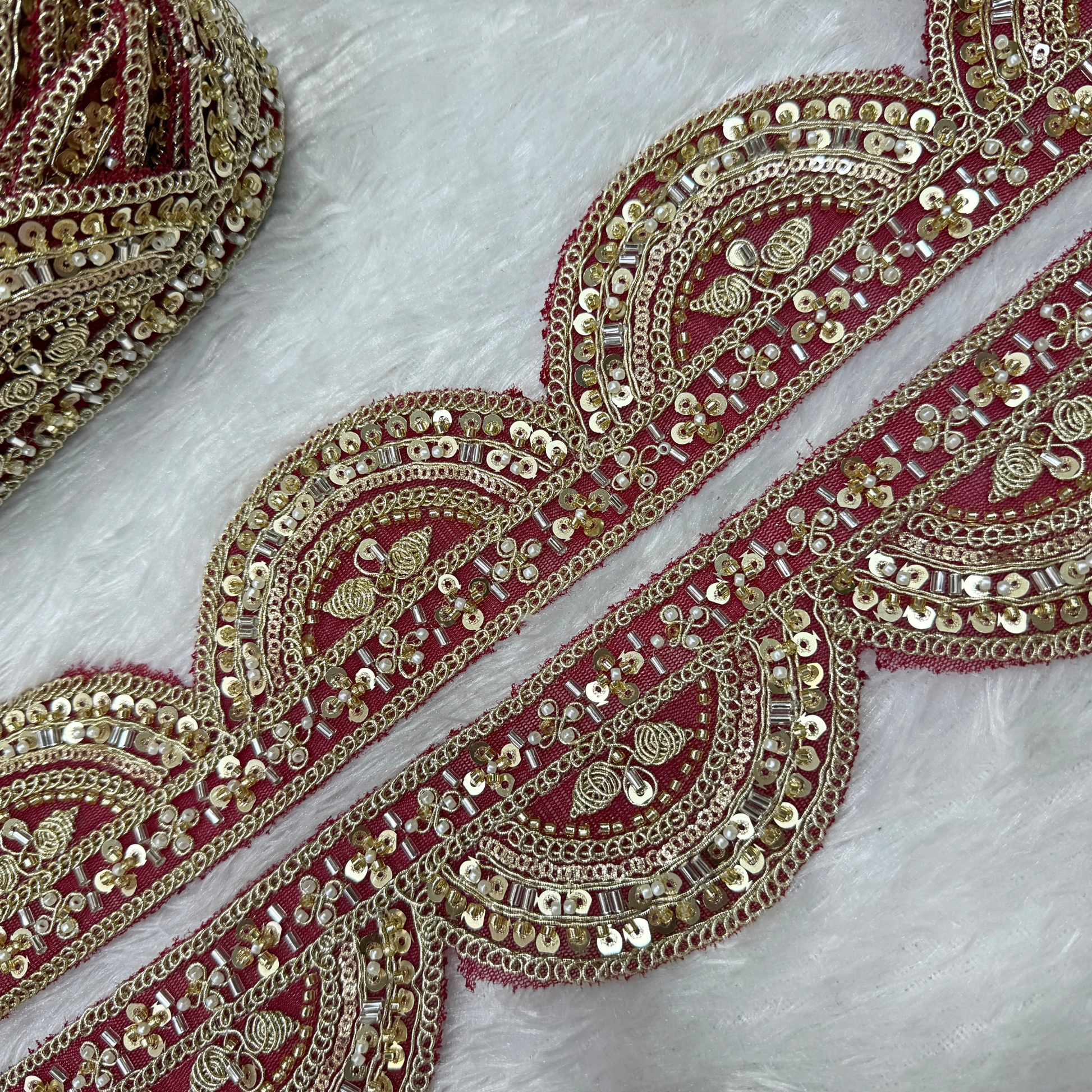 Designed on a deep red base, this border features intricate zari embroidery, layered sequin detailing, and traditional paisley-inspired motifs arranged in a structured scalloped pattern. The combination of gold threadwork and reflective embellishments creates depth, shine, and timeless wedding elegance.