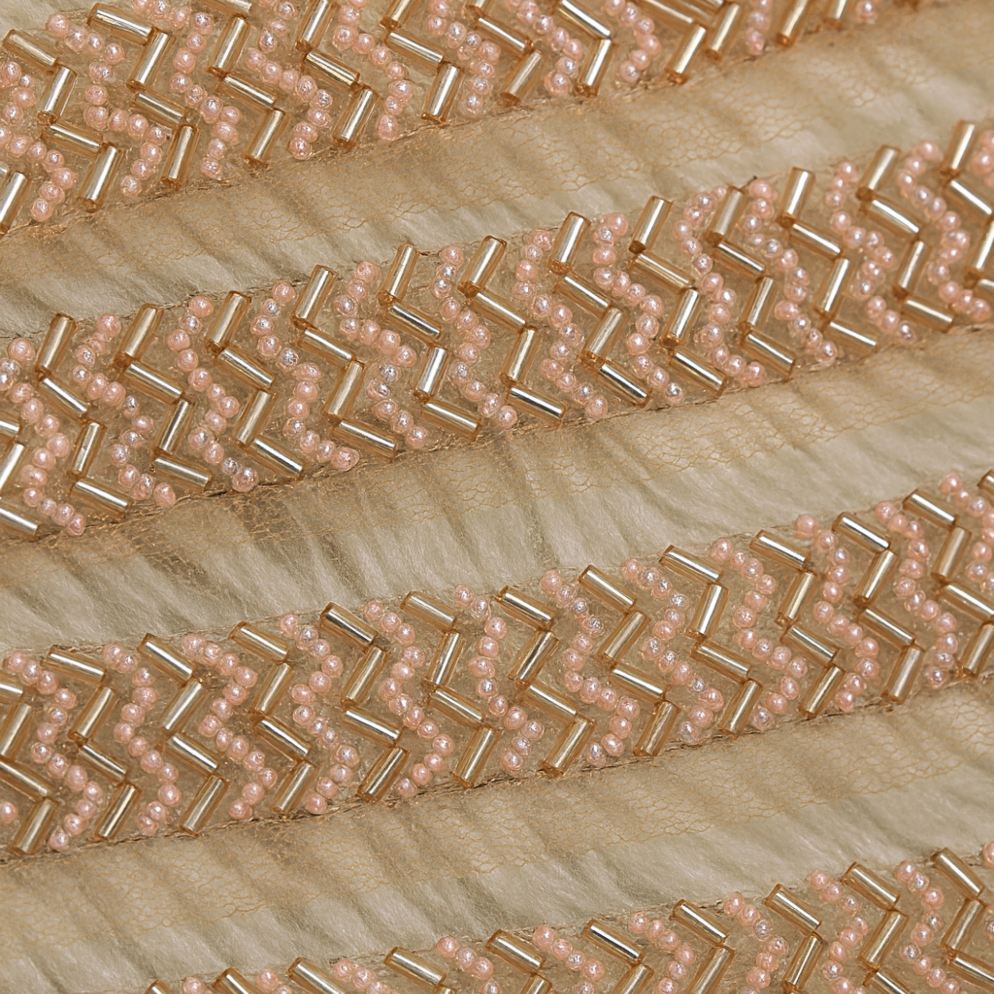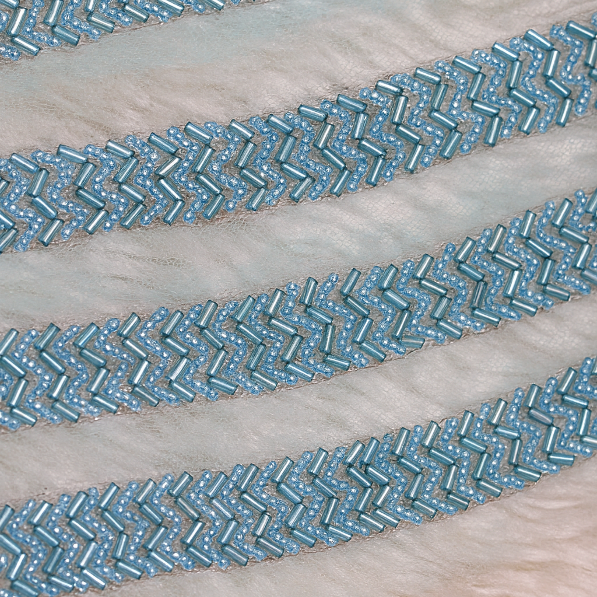 Add a touch of shimmer and structure to your designs with our Zigzag Beaded Lace Collection. Each piece features intricate hand embroidery with glossy bugle beads and delicate seed pearls woven into a striking chevron pattern on a soft net base. Available in vibrant and subtle hues, this lace is perfect for elevating sarees, dupattas, blouses, lehengas, and even DIY craft projects.